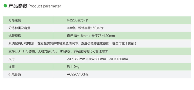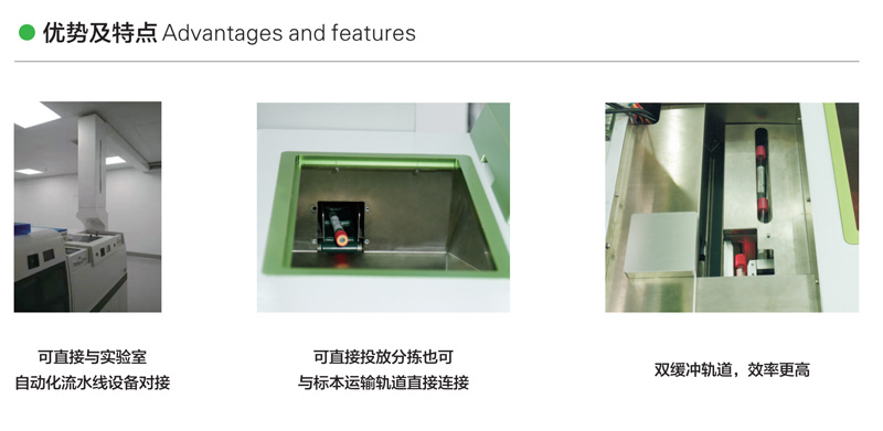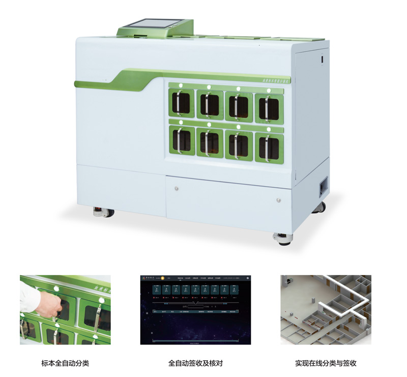 血液标本智能分拣机主要是通过标本号,对血液标本进行全自动分拣及签收;它的前端可以与标本自动运输轨道进行连接,后端亦可以连接轨道与实验室自动流水线直接实现无缝对接。